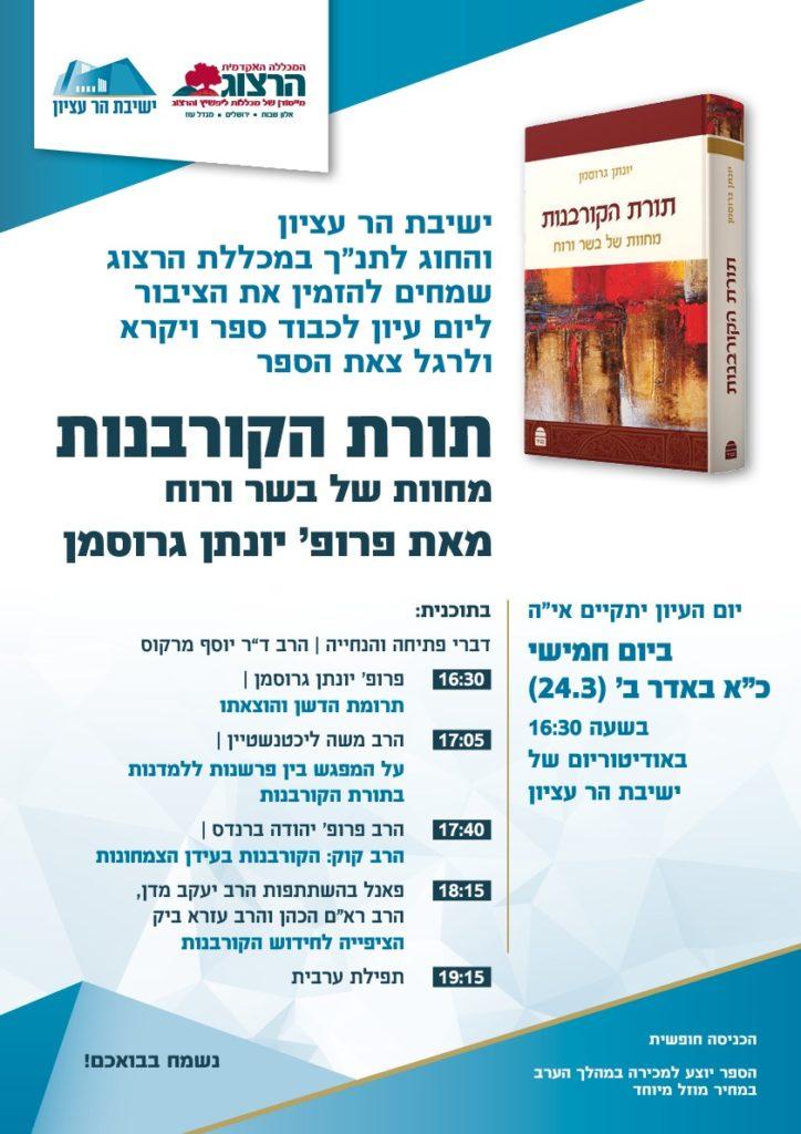 ערב עיוו לרגל צאת הספר תורת הקורבנות מחווה של בשר ורוח מאת פרופ' יונתן גרוסמן